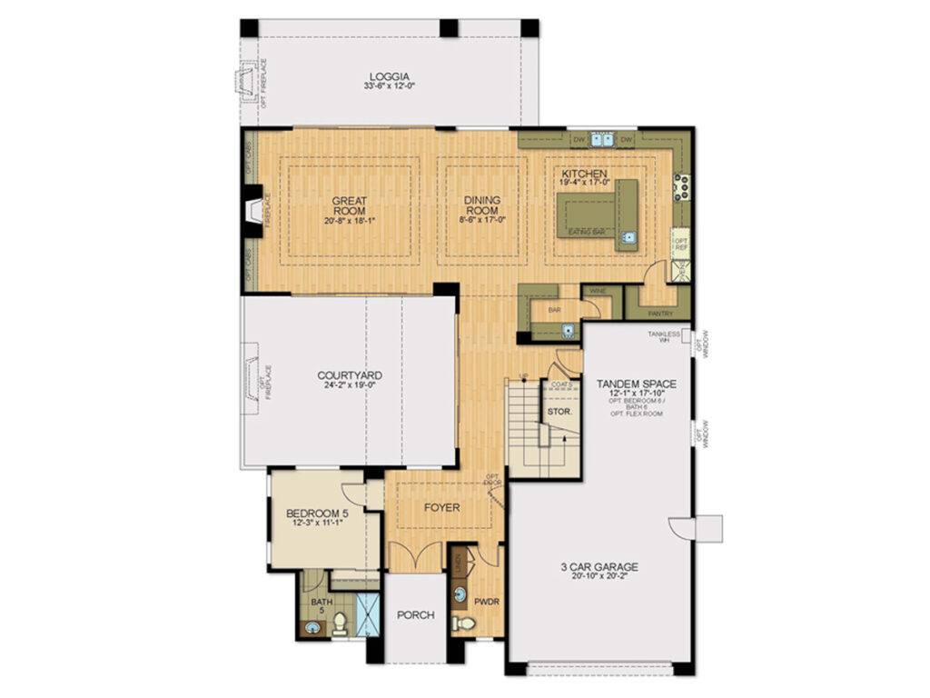 Gourmet Kitchen, Optional Bar at Great Room, Great Room with Fireplace, Optional Multi-slide Door at Great Room, Courtyard with Optional Fireplace, Optional Multi-slide Door at Courtyard, Loft, Optional Deck at Loft, Optional Covered Logia with Optional Fireplace, Optional Flex Room/Bedroom 6 and Bathroom 6 at Garage, Optional Fireplace at Masters Suite, Optional Deck at Masters Suite, Optional Coffee Bar at Masters Suite, Optional Second Water Closet/Bidet in Master Bath, Rooftop Solar, Vehicle Charging Station, WaterSmart Landscaping
